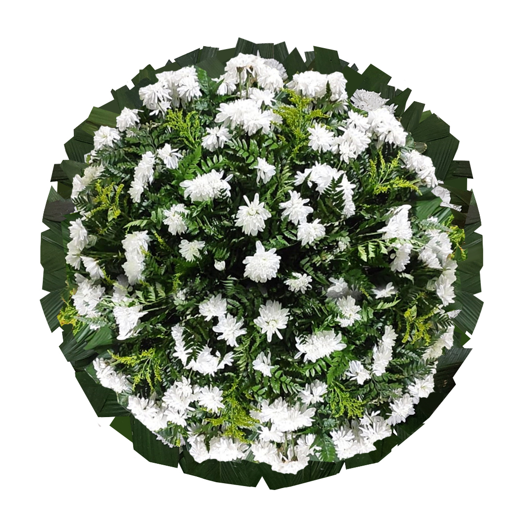 Flores em tons Brancos, Crisantemos Selecionados compõem esta Coroa de Flores que normalmente vemos em Velórios de pessoas de todas as idades e religiões.