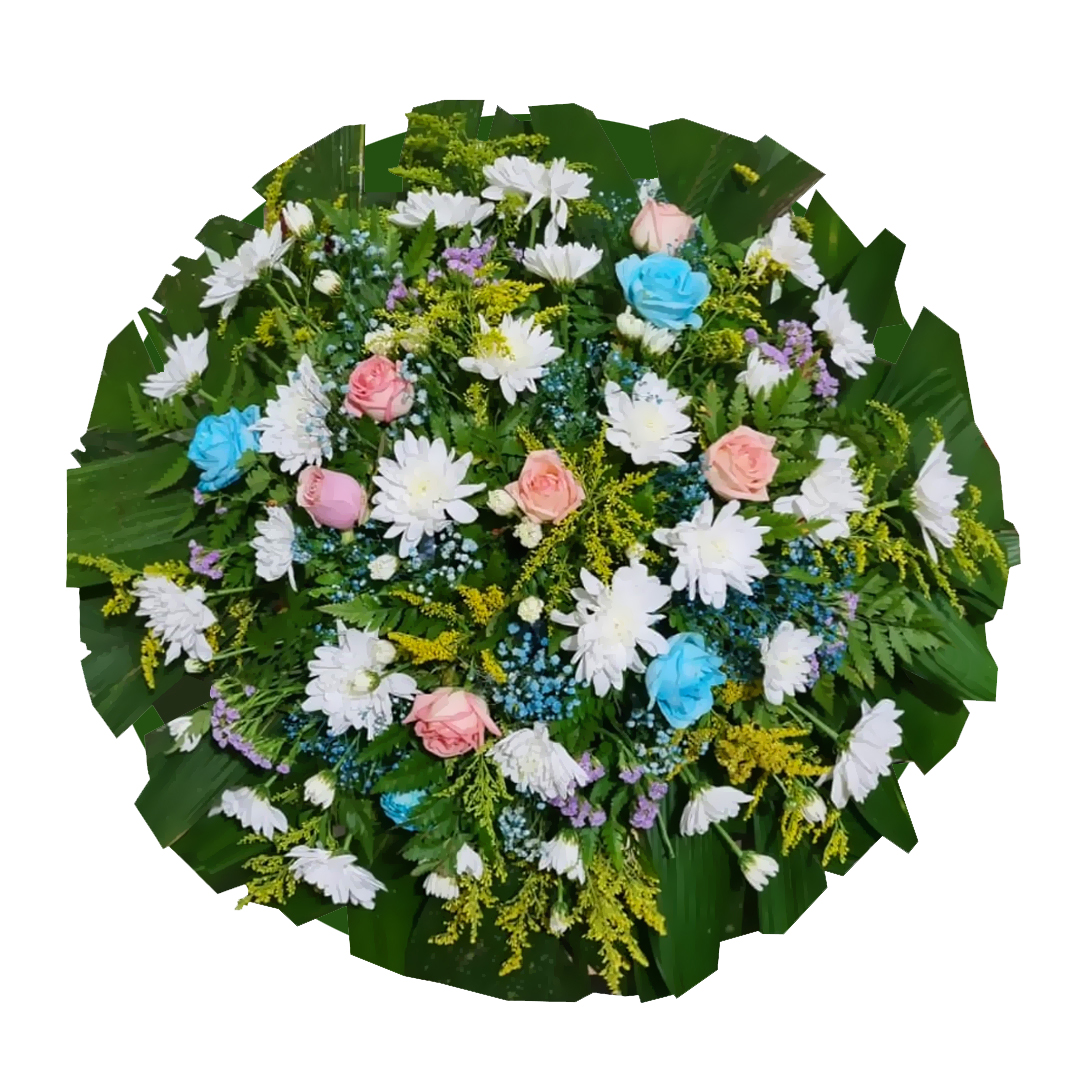 Flores em tons Azul, Goiaba e Branco que compõem esta Coroa de Flores tradicional que normalmente vemos em Velórios de pessoas de todas as idades e religiões.