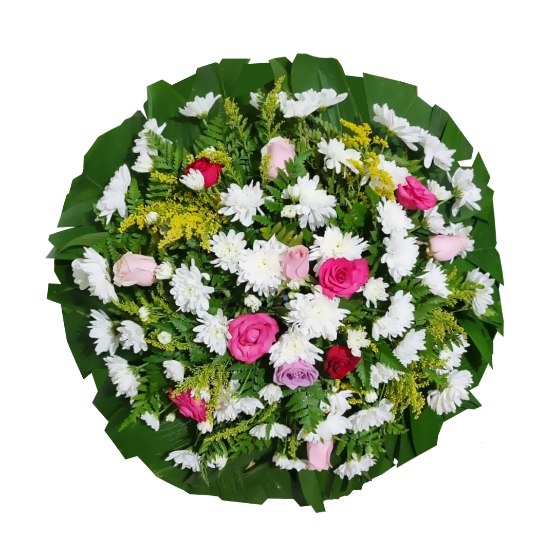 Flores em tons Rosa, Lilás, Vermelho e Branco. Folhagem especial que compõem esta Coroa de Flores tradicional que normalmente vemos em Velórios de pessoas de todas as idades e religiões.