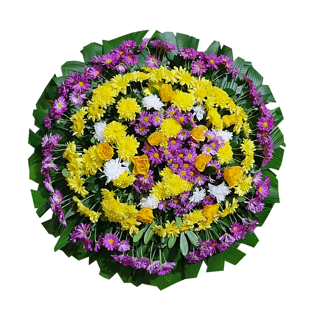 Folhagens em tons coloridos (Amarelos, Lilás e Brancos) que compõem esta Coroa de Flores tradicional que normalmente vemos em Velórios de pessoas de todas as idades e religiões.