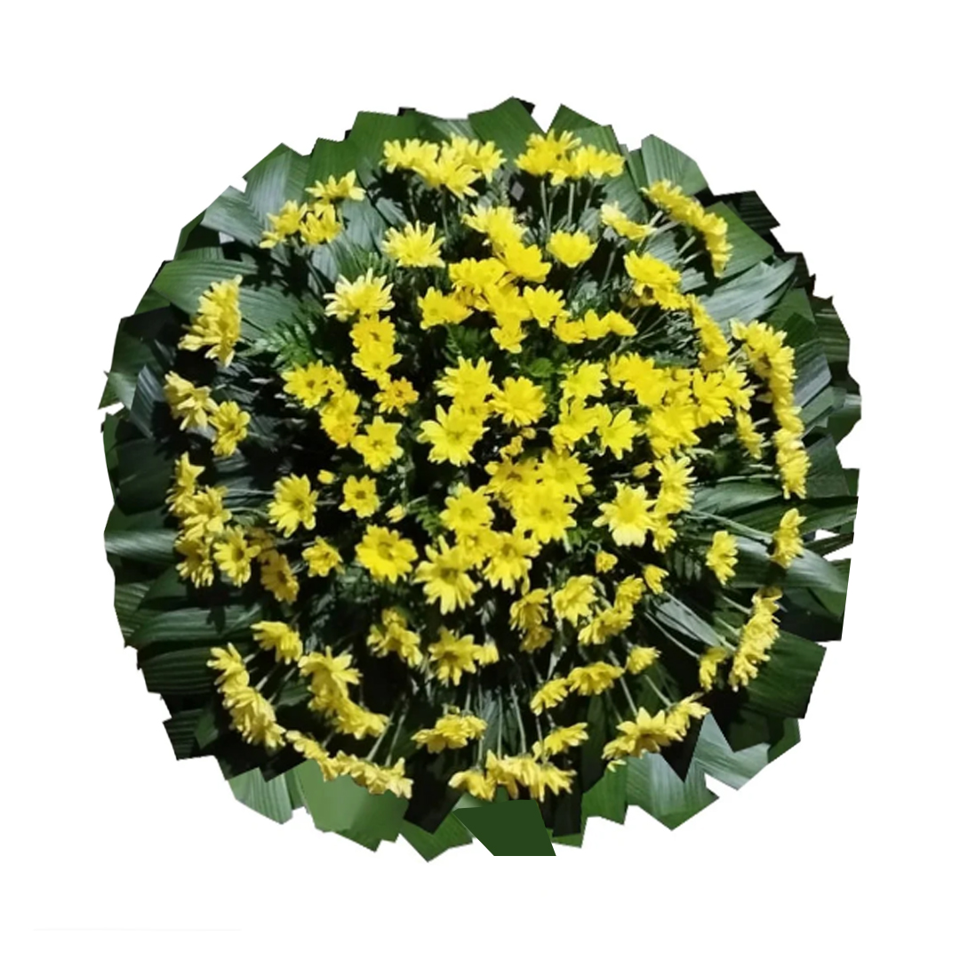 Coroa de Flores em tons Amarelos, com Margaridas amarelas e uma folhagem especial que harmoniza esta Coroa de Flores. Normalmente vemos em Velórios de pessoas de todas as idades e religiões.
