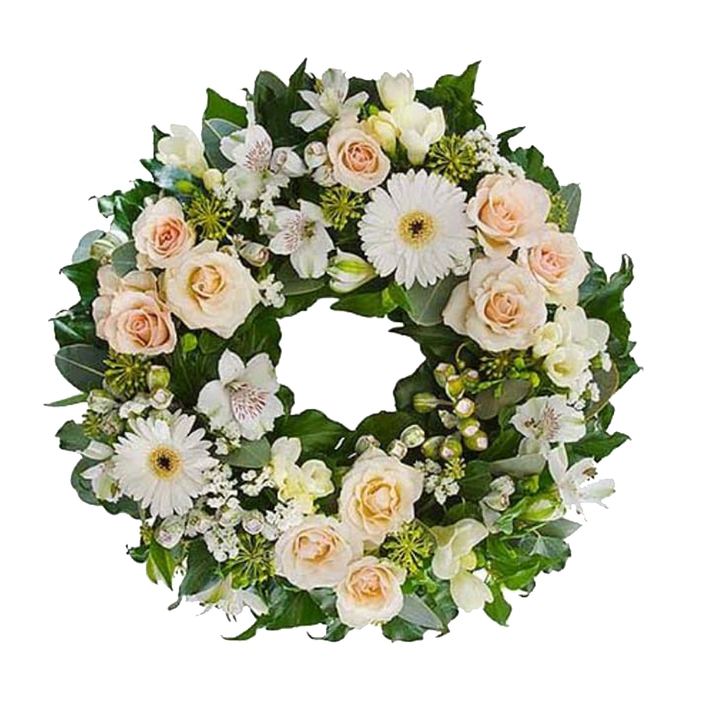 Coroa de Flores Estilo Arco Americano, Com Flores em Tonalidades Claras e folhagem especial selecionada. Esta diferenciada e elegante, envia uma mensagem sincera de profundo pesar aos familiares e amigos.