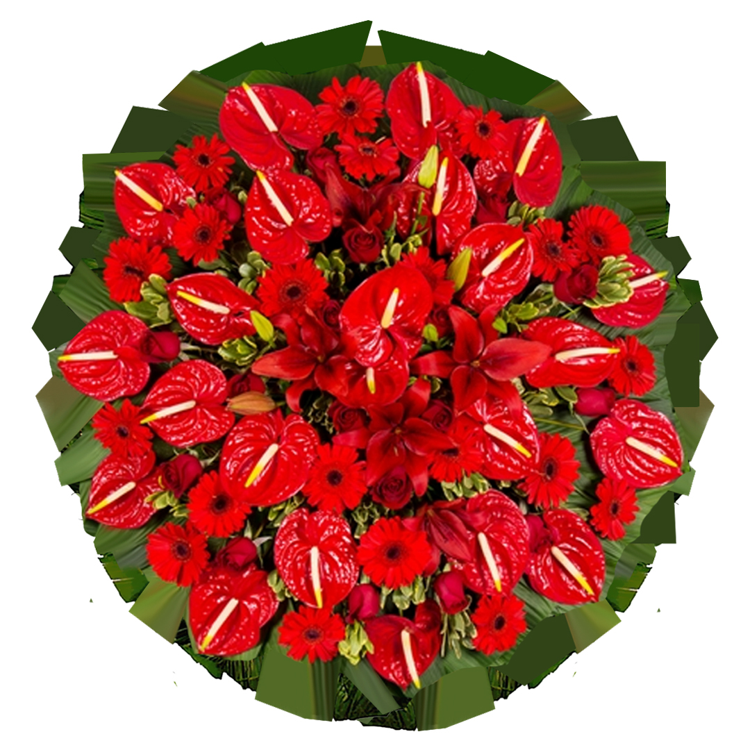 Elaborada com flores vermelhas (Antúrio, Rosas, Lírios e Gérberas), com acabamento no em tom verde, está coroa de flores é ideal para quem quer sofisticação e seriedade na hora de realizar uma última homenagem para uma pessoa querida e amada.