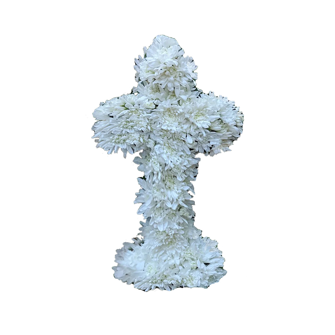 Cruz de Flores Naturais, Formato adaptado. Cor predominante branca com Rosas Comlombianas Brancas, Lírios Brancos no Centro e Acabamento especial.